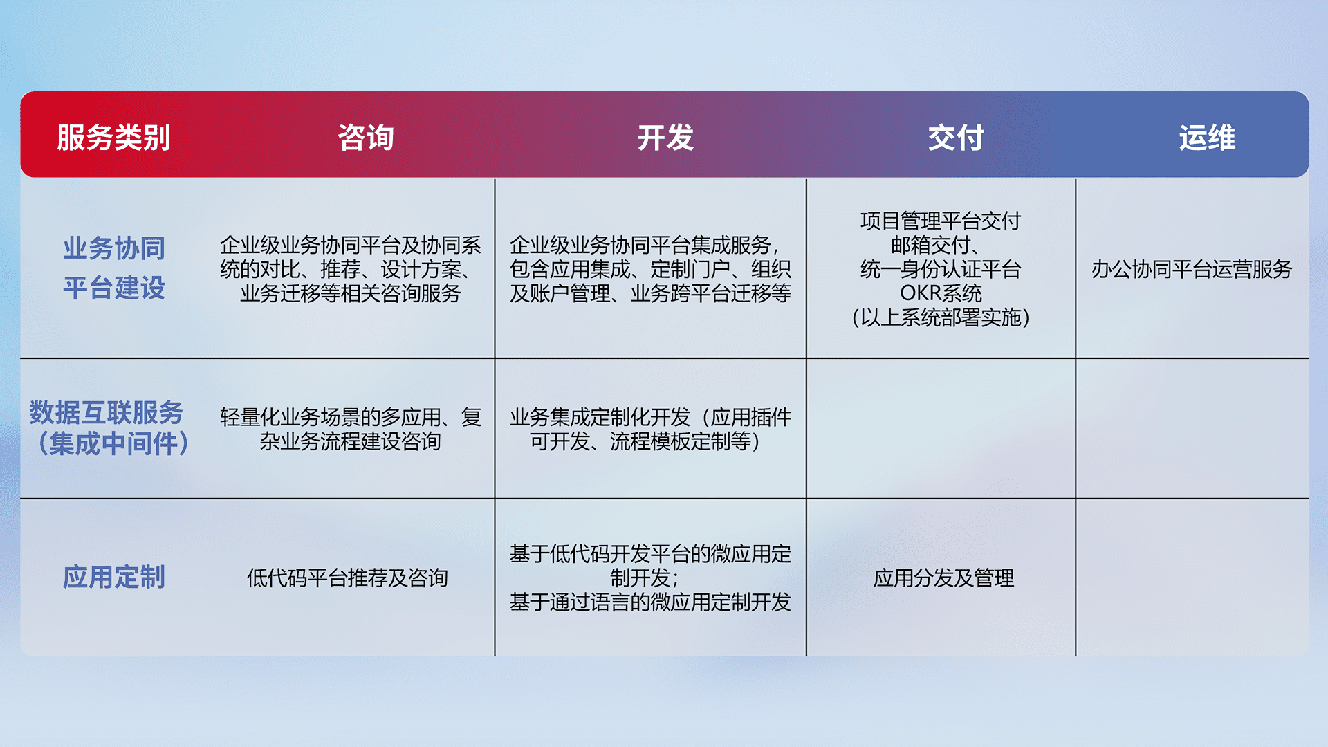 针对钉钉、、、企微、、、、IDaas等平台级产品提供产品的规划、、、方案、、交付、、、、定制化开发等服务,,,,实现如统一协同办公、、、智能客户服务、、、、混合会议管理、、智能数据查询、、等业务场景,,实现数字化转型。。